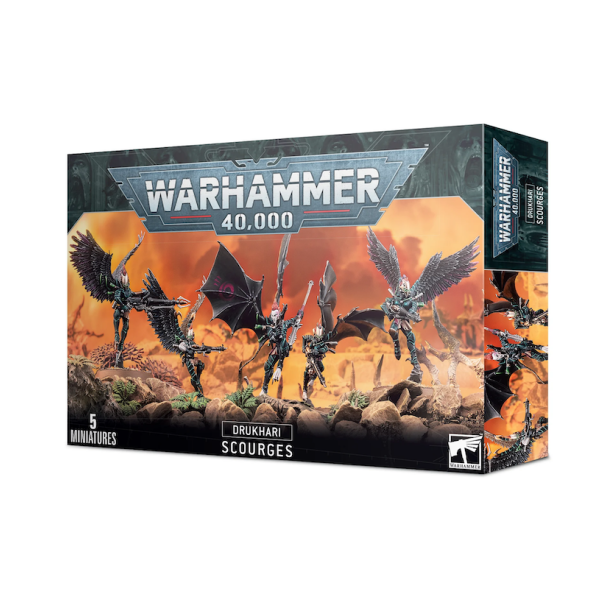 A rich and daring Drukhari may surrender himself to the Haemonculi, requesting that his bones be hollowed out, that bands of new muscle be grafted onto his torso, and powerful wings and adrenaline dispensers be attached to his shoulders so that he is capable of true flight. The Kabal overlords pay handsomely for these veteran warriors to fight for them and as a result the Scourges will often equip themselves with the best weaponry and armour that they can find. It is rare for the Scourges to engage the enemy up close, preferring to lay down a withering hail of fire before flying away out of harm's reach.
