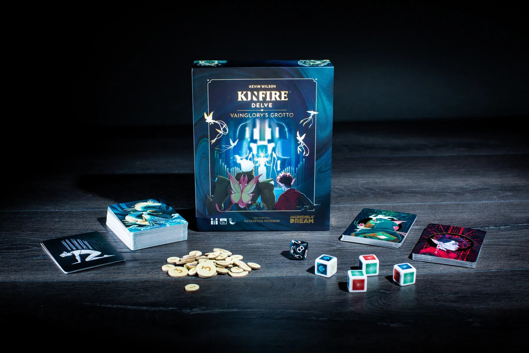Kinfire Delve: Vainglory's Grotto is a tactical and cooperative card game. As Seekers, you will fight your way through the well deck of challenge cards to reach Vainglory, the master of the well, and face her in an epic final battle.